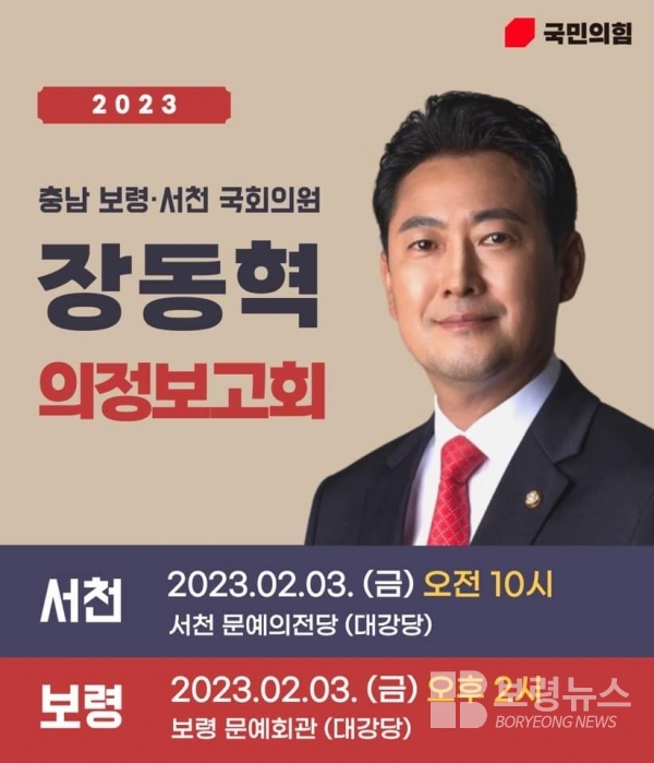 보령.서천 국회의원(장동혁.국민의힘원내대변인)이 2023.02.03 금요일 오전10시 서천문예의 전당 에서 서천 군민들에게 그동안 국회에서 활동한 의정에 대하여 '의정보고회'를 갖는다. 당일 오후 2시에는 보령 문예회관(대강당)에서 보령시민을 상대로 '의정보고회'가 이어진다. 저작권자 © (주)보령뉴스 무단전재 및 재배포 금지 방덕규 기자 다른기사 보기