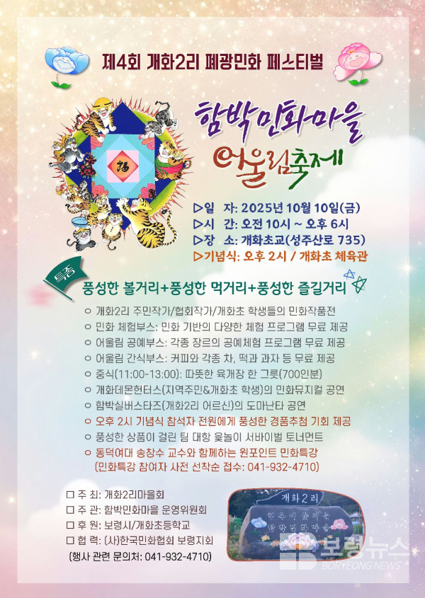 보령시와 개화초등학교가 후원하고 개화2리 마을회/함박민화마을 운영위원회가 주최/주관하는 제4회 개화2리 폐광민화마을 페스티벌 ‘함박민화마을 어울림축제’가 25.10.10(금) 10시~18시까지 개화초교에서 열린다.
