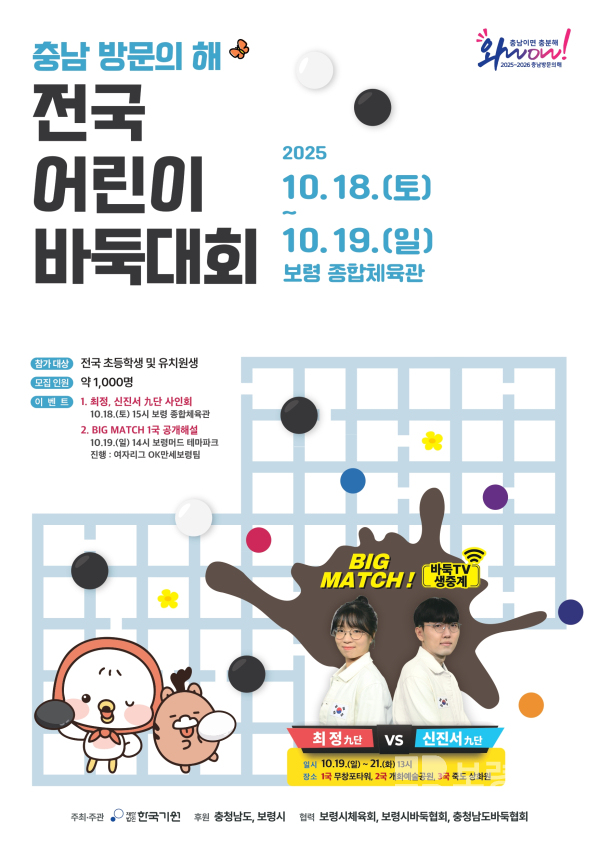 한편, 대회와 연계해 19일부터 21일까지 사흘간 ‘최정 9단 vs 신진서 9단 빅매치(BIG MATCH)’가 함께 진행된다. 1국은 무창포타워, 2국은 개화예술공원, 3국은 죽도 상화원에서 열리며, 1국 공개해설은 오후 2시 보령머드테마파크에서 진행될 예정이다. 이번 대국은 보령시의 대표 관광 명소와 스포츠가 어우러진 특별한 행사로 기대를 모으고 있다.