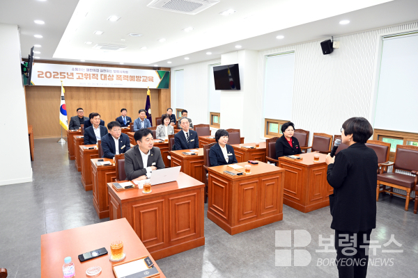 보령시의회(의장 최은순)는 20일 의회 1층 회의실에서 의원과 사무국장, 수석전문위원 등 고위직 15명을 대상으로 ‘2025년 고위직 대상 폭력예방교육’을 실시했다.