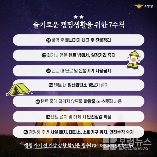 고광종 보령소방서장은 “캠핑의 즐거움은 안전이 전제될 때 완성된다”며 “전기·가스·난방기구 사용 시 각별히 주의하고, 경보기와 소화기 등 안전장비를 갖춰 사고 없는 캠핑문화를 만들어가길 바란다”고 말했다.