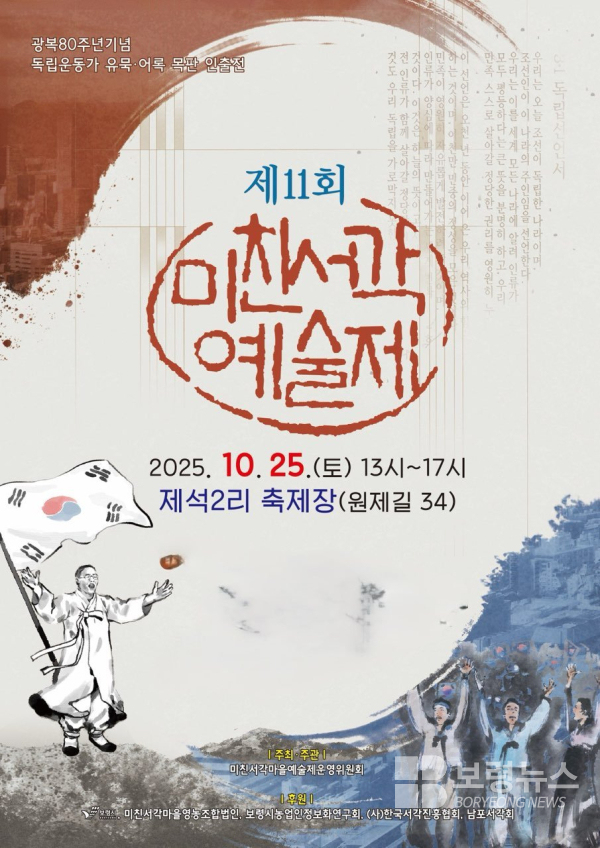 제11회를 맞는 미친서각 예술제가 남포면 미친서각마을 축제장(원제길 34)에서 열린다. 올해는 광복 80주년을 맞아 ‘독립운동가 유묵·어록 새김전’을 테마로 특별히 기획됐다.