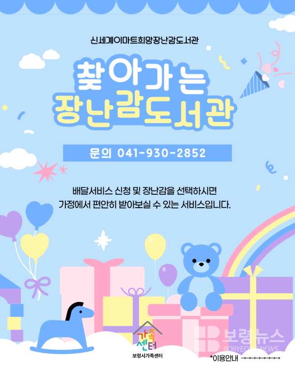 보령시는 읍·면 지역 거주 미취학 자녀 가정의 육아 부담을 덜어주기 위해 12월 31일까지 ‘찾아가는 장난감도서관’ 배달서비스를 시범 운영한다고 밝혔다.