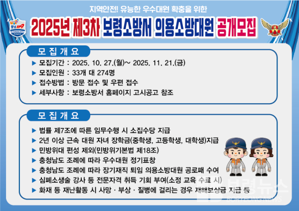 보령소방서(서장 고광종)는 10월 27일부터 11월 21일까지 26일간 ‘2025년 제3차 신규 의용소방대원’을 공개 모집한다고 밝혔다.