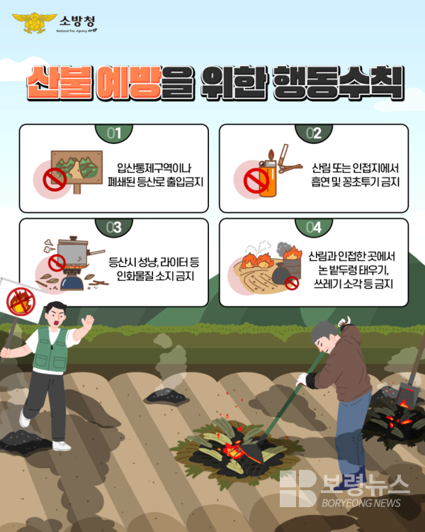 보령소방서(서장 고광종)는 최근 건조한 날씨와 함께 영농활동이 활발해짐에 따라, 논·밭두렁 및 생활쓰레기 소각 등으로 인한 산불 발생 위험이 높아지고 있다며 시민들의 각별한 주의를 당부했다.