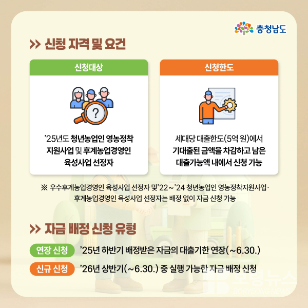 내년 상반기 충남 배정액은 354억 5000만 원으로, 올해 청년농업인영농정착지원사업과 후계농업경영인육성사업 선정자가 신청할 수 있다.