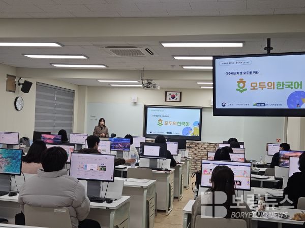 보령교육지원청(교육장 한태희)은 11월 25일 보령창의예술꿈키움센터 2층 컴퓨터실에서 관내 초·중학교 다문화 업무 담당자 38명을 대상으로 ‘2025년 모두의 한국어 담당자 배움자리’를 운영했다. 이번 배움자리는 모두의 한국어 서비스의 학교 현장 안착을 위한 기반 조성과 교원의 한국어 교육 활용 역량을 강화하기 위해 마련됐다.