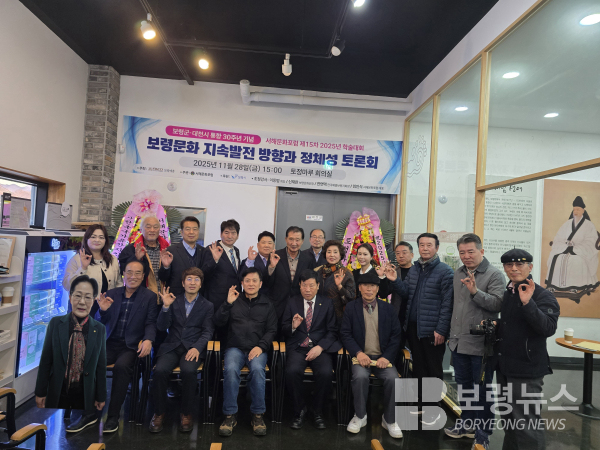 초청강연에 나선 신재완 보령문화원장은 보령군·대천시 통합 30년의 문화사적 의미를 심도 있게 설명하며, 통합은 단순한 행정 결합이 아니라 생활문화·전통·정체성이 하나의 문화생태계로 융합된 역사적 흐름이라며 보령은 농경문화·해양문화·산림문화가 결합된 복합문화권으로 성장하여 천년 문화유산(성주사지·충청수영성·토정 이지함)과 현대문화(머드축제·예술행사), 시민 생활문화가 결합하며 독자적 생태계를 형성해 나아갈 것이라고 강조했다.