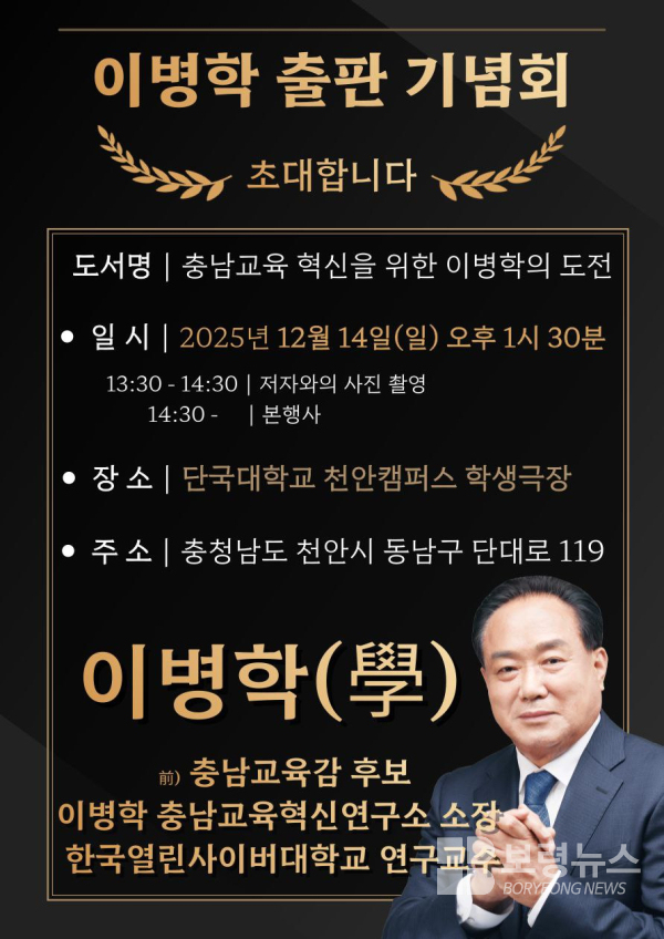 충남교육의 현안 및 미래전략과 교육 혁신 방향을 집대성한 저서 『충남교육 혁신을 위한 이병학의 도전』의 발간에 맞춰, 저자인 이병학 소장이 오는 2025년 12월 14일(일) 오후 1시 30분(식전행사: 13:30, 본행사: 14:30분), 단국대학교 천안캠퍼스 학생극장에서 출판기념회를 개최한다.