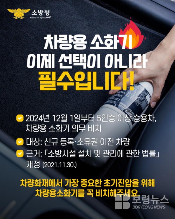 고광종 보령소방서장은 “최근 주행 중 차량 화재가 연이어 발생하면서 운전자의 예방 습관과 초기 대응의 중요성이 더욱 커지고 있다”며 “차량용 소화기 한 대가 큰 피해를 막는 만큼, 모든 운전자께서 차량 점검과 함께 반드시 차량용 소화기를 비치해 주시길 바란다”고 말했다.