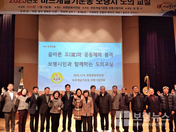 바르게살기운동 보령시협의회(회장 이성천)는 12.8.문화원에서 16개 읍·면·동 위원회 회원250여 명이 참여한 가운데 우리 사회를 더 건강하고 올바른 방향으로 이끄는 시민 의식의 중요성을 일깨우며 올바른 도(道)와 공동체의 품격을 함양하기 위한 시민 도의교실을 운영하였다