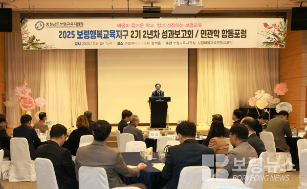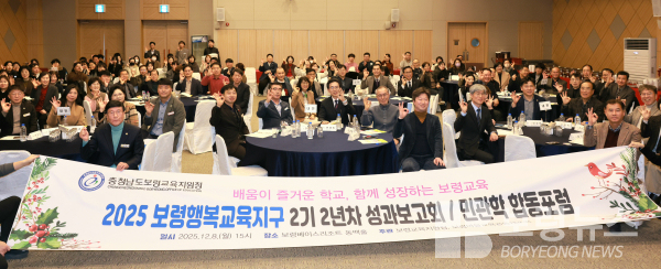 보령교육지원청(교육장 한태희)은 12월 8일 보령베이스리조트 동백홀에서 관내 교장 및 업무담당교사, 마을교사(활동가), 지자체 담당자 등 150여 명이 참석한 가운데 ‘2025 보령행복교육지구 2기 운영 2년차 성과보고회 및 민·관·학 합동포럼’을 개최했다.
