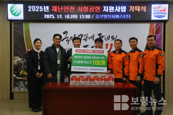 보령소방서(서장 고광종)는 지난 16일 보령소방서 2층 소회의실에서 중부발전서비스(주)의 산소발생마스크 100개 전달에 따른 기증식을 열고 감사의 뜻을 표했다고 밝혔다.