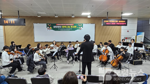 보령청소년오케스트라 단원과 지도교사 약 30여명은 12월 23일 2시 대천역 중층 대합실에서 흥겨운 크리스마스 캐롤과 맘마미아 등 귀에 익숙한 명곡으로 시민과 관광객에게 행복과 기쁨을 전했다.
