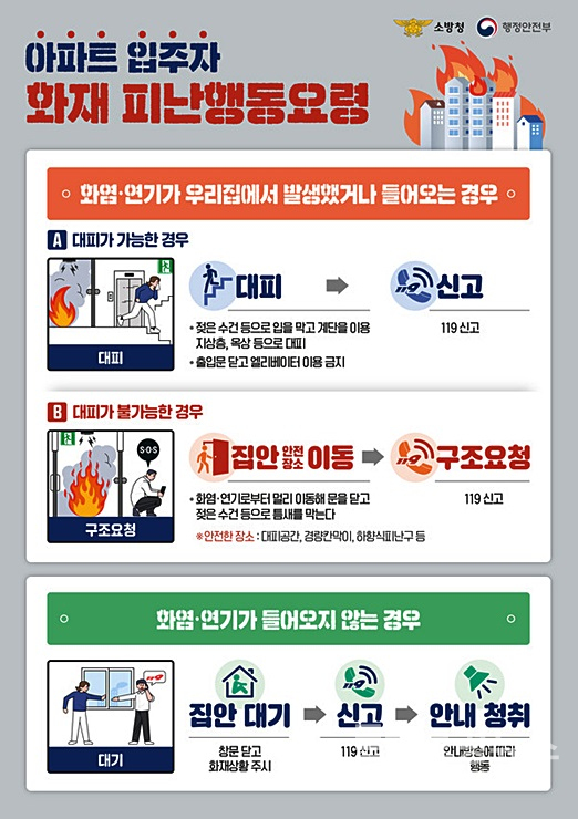 반면, 현관이나 대피로에 연기나 불길이 있어 외부 대피가 어려운 경우에는 집 안의 대피공간이나 경량 칸막이가 설치된 방 등 안전한 장소로 이동해 119에 신고한 뒤, 문을 닫고 젖은 수건 등으로 문틈을 막아 연기 유입을 차단한 상태에서 구조 안내에 따라 대기하는 것이 바람직하다.