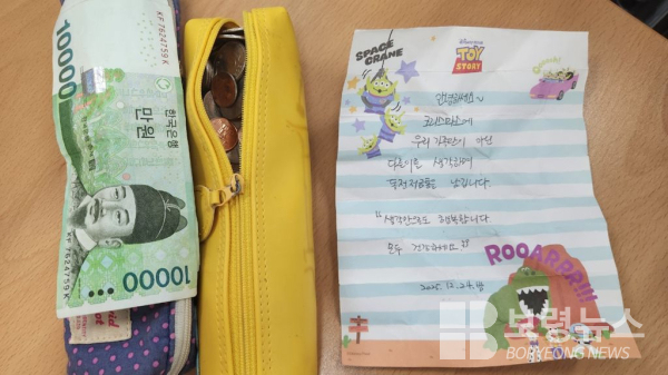 성탄 전야인 지난 24일 밤, 충남 보령시 대천3동 행정복지센터 출입문 앞에 온기 가득한 선물이 놓였다. 익명의 기부자가 두고 간 이 선물 꾸러미에는 정성껏 모은 동전이 가득 담긴 필통과 진심 어린 마음이 적힌 손편지가 들어 있었다.