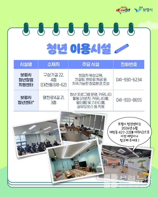 명천로4길 21, 3층에 위치한 청년커뮤니티센터는 보령시 거주 청년들을 위한 활동 공간이다. 평일 오전 9시~오후 9시 운영되며, 공휴일은 휴무다.