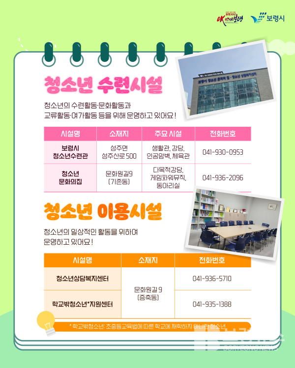 보령시는 청소년들의 건강한 성장과 청년들의 창업 및 활동 지원을 위해 청소년 시설 2개소, 청년 시설 2개소 등 총 4개소의 전용 시설을 운영하고 있다.