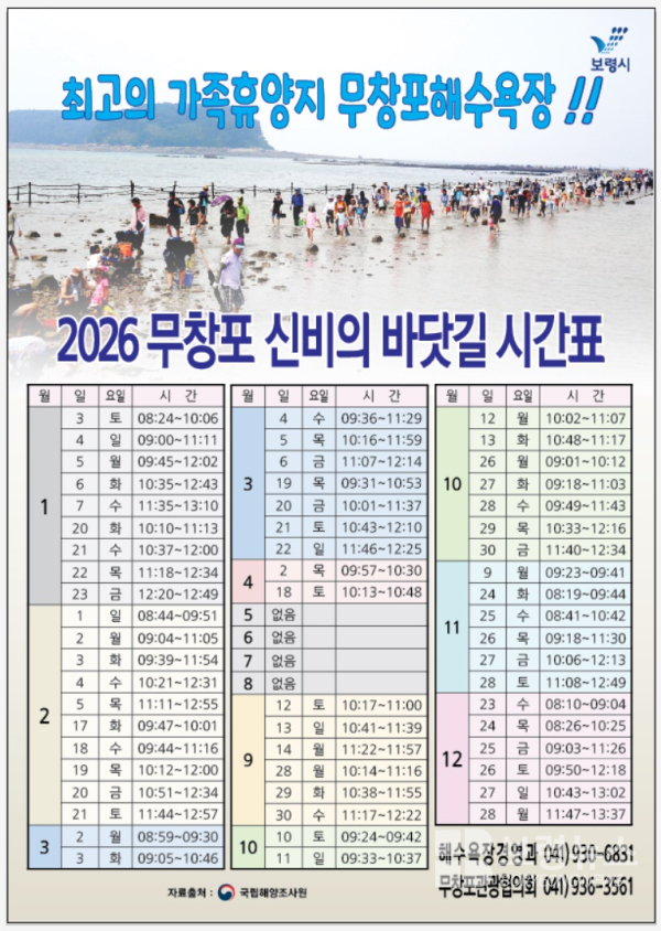 보령시가 2026년 무창포 해수욕장 신비의 바닷길 시간표를 안내하며 관광객들의 방문을 환영한다고 전했다.