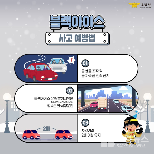 보령소방서는 블랙아이스 구간에서는 제동거리가 평소보다 2~3배 이상 길어질 수 있는 만큼 ▲감속 운행 ▲차간 거리 충분히 확보 ▲급가속·급제동·급회전 자제 ▲차량 사전 점검 등 안전수칙을 철저히 지킬 것을 당부했다.