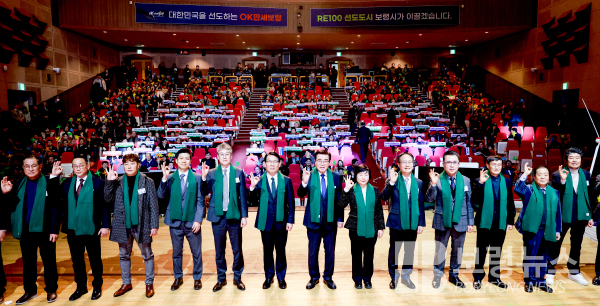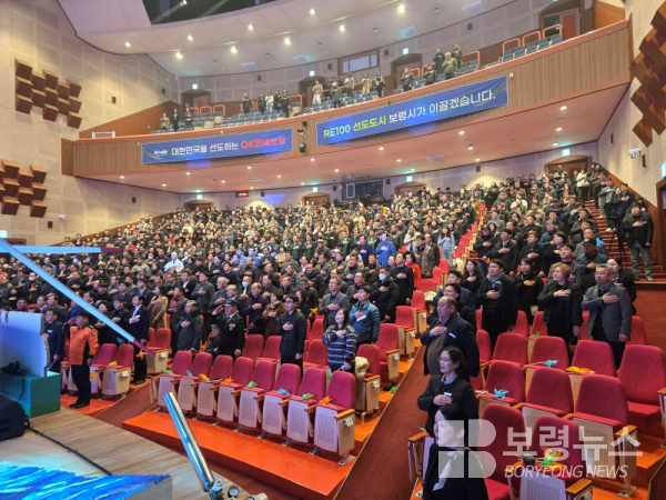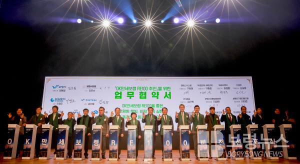 보령시는 13일 보령문화예술회관 대공연장에서 ‘바람과 햇빛, OK만세보령의 미래가 되다’를 주제로 시민 800여 명이 참석한 가운데 RE100 비전선포식 행사를 개최했다. RE100(Renewable Energy 100)은 기업이나 가정에서 사용하는 전력을 100% 재생에너지 전력으로 충당하는 것을 의미한다.