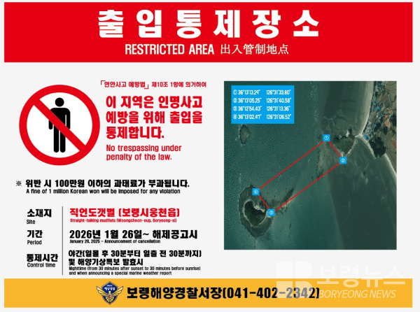보령해양경찰서(서장 이근영)는 충남 보령시 웅천읍 독산해수욕장 직언도 갯벌을 출입통제구역으로 지정하고 오는 2026년 1월 26일부터 시행한다고 밝혔다.