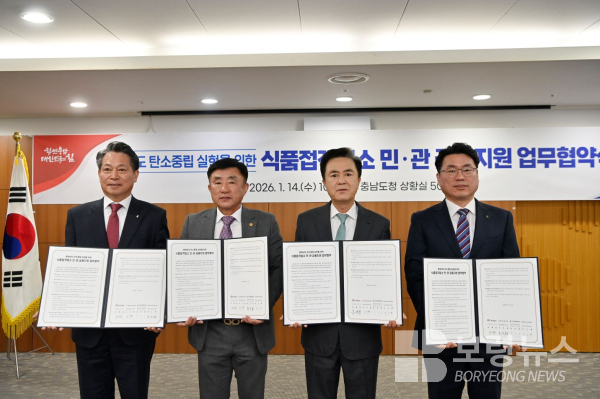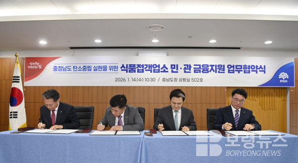 김태흠 지사는 14일 도청 상황실에서 오주현 NH농협은행 충남본부장, 윤석용 한국외식업중앙회 충남도지회장, 조소행 충남신용보증재단 이사장과 식품접객업소 민관 금융 지원 업무협약을 체결했다.