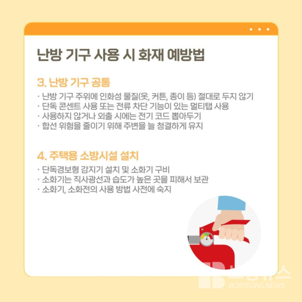 고광종 보령소방서장은 “겨울철 단독주택 화재는 작은 부주의가 큰 인명피해로 이어질 수 있다”며 “소화기와 단독경보형감지기 설치는 물론, 시민 눈높이에 맞춘 찾아가는 화재예방교육을 통해 안전의식을 높여 나가겠다”고 말했다.