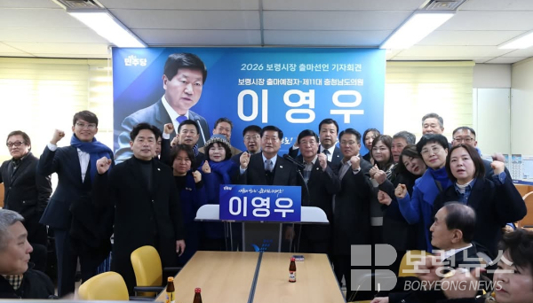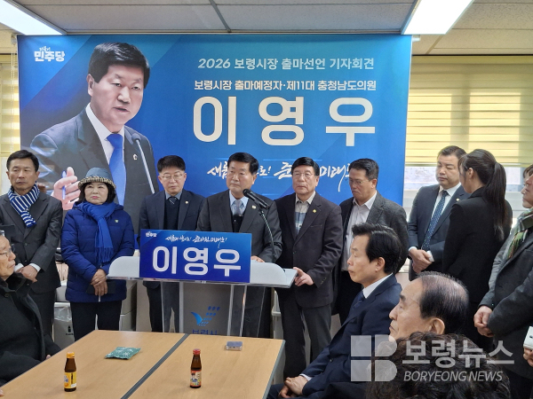이영우 더불어민주당 전 충남도의원이 2.3.10:30 보령시청 기자실에서 언론인과 이시우 전보령시장을 비롯하여 전.현직 도의원과 시의원 지역원로와 시민 등 150여 명의 지지자들이 참석한 가운데 기자회견을 열고 오는 6.3 지방선거에 보령시장 출마를 공식 선언했다.