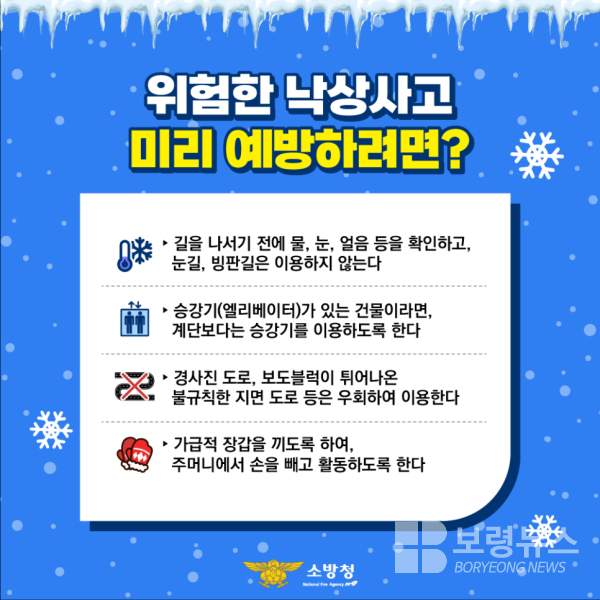 고광종 보령소방서장은 “최근 내린 눈과 낮은 기온으로 도로와 보행로가 얼어 있는 상황에서는 작은 부주의가 큰 사고로 이어질 수 있다”며 “시민들께서는 외출 시 빙판길 등 미끄러운 노면에 각별히 유의해 주시길 바란다”고 말했다.