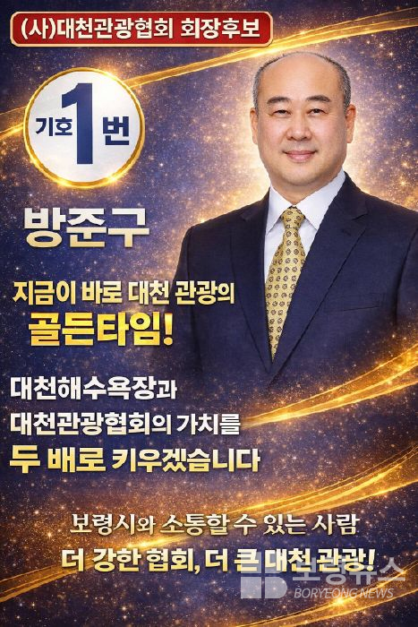 기호 1번을 부여받은 방준구 후보는 "회원과 함께 성장하는 협회", "회원의 목소리를 소중히 듣는 협회", "대천해수욕장과 대천관광협회의 가치를 두 배로 키우겠다"는 포부를 밝히며 '(사)대천관광협회' 회장 출마의 뜻을 밝혔다.