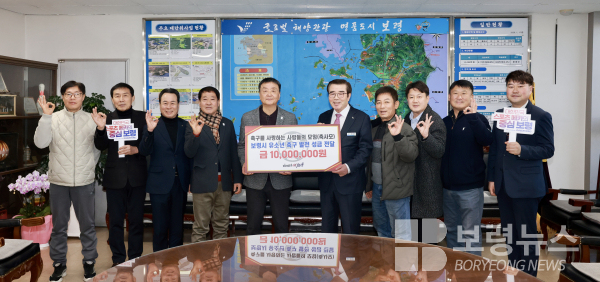 보령 축사모(축구를 사랑하는 사람들의 모임)가 9일 시장실에서 보령시 유소년 축구 육성 및 발전을 기원하며 성금 1,000만 원을 기탁했다.