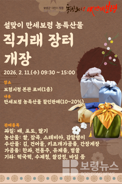 보령시는 설을 맞아 오는 11일 오전 9시 30분부터 오후 3시까지 보령시청 본관 1층 로비에서 ‘2026년 설맞이 만세보령 농특산물 직거래장터’를 운영한다고 밝혔다.