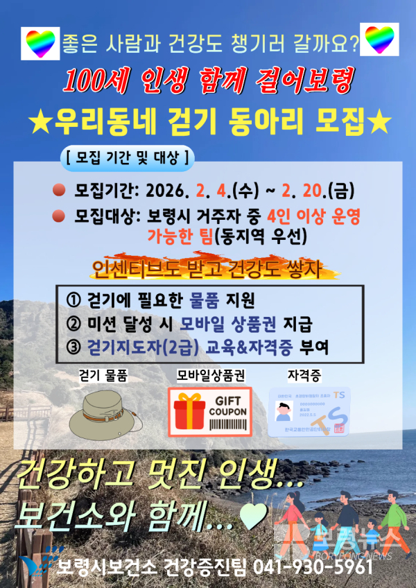 보령시는 주민의 신체활동 증진과 건강한 생활습관 형성을 위해 ‘우리동네 걷기동아리’ 참여 팀을 오는 20일까지 모집한다.
