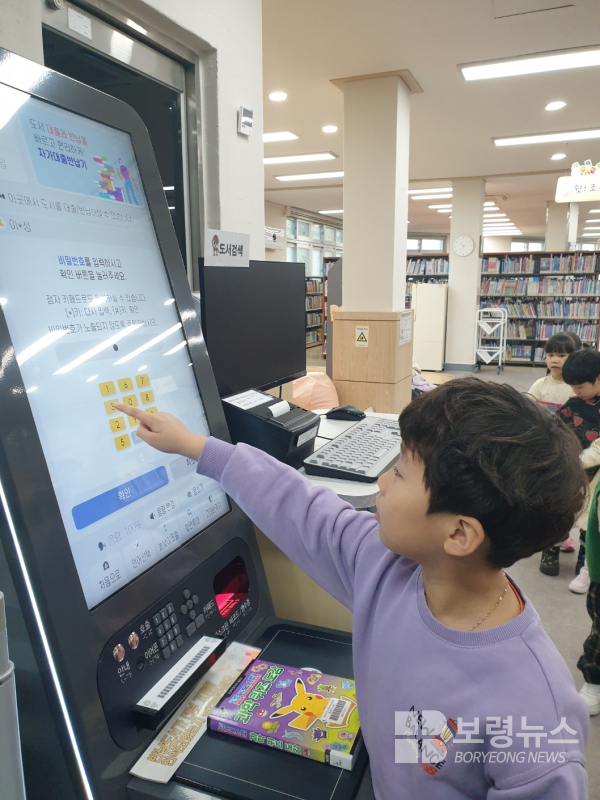 이어 진행된 ‘도서관 구석구석 둘러보기’에서 유아 전용 서가에서 읽고 싶은 책을 직접 골라보고 자가대출반납기를 이용해 스스로 책을 빌려보는 등 체험을 통해 도서관 이용 예절을 몸소 익혔다,