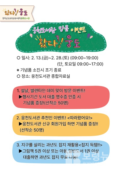 보령교육지원청웅천도서관(관장 류미정)은 겨울방학을 이용한 도서관 이용 활성화와 다양한 연령층 독자 확보를 위해 2월 13일 부터 2월 28일까지 종합자료실에서 ‘있다!?, 웅천도서관’ 이벤트를 진행한다고 밝혔다.
